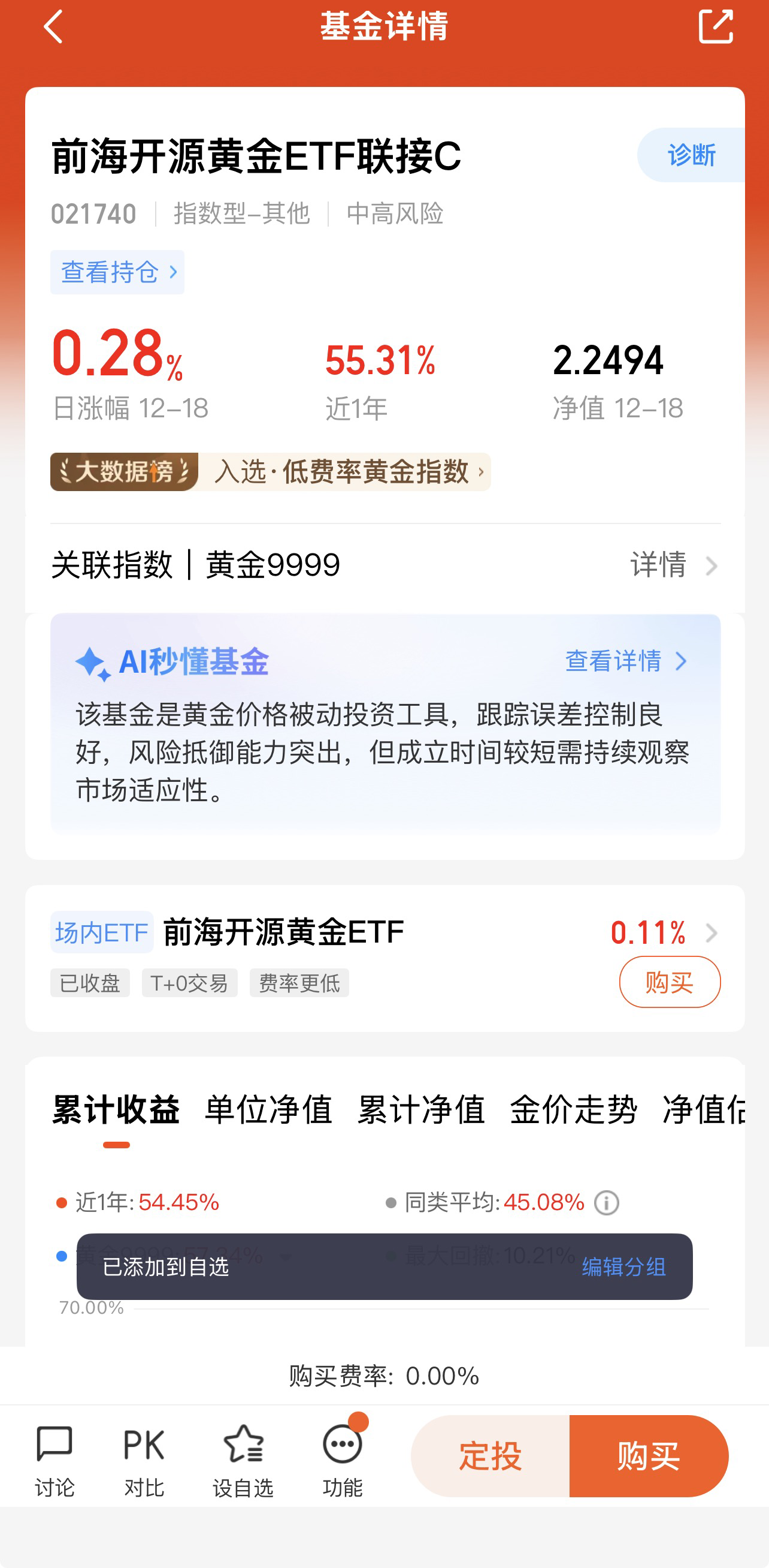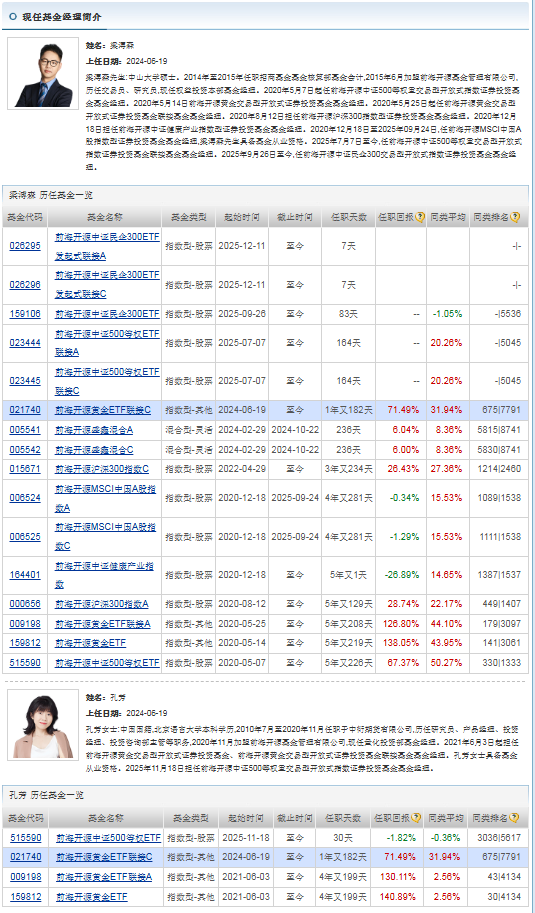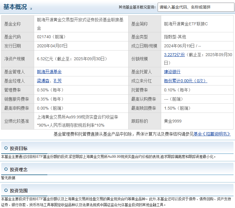 9.跟踪精准且管理团队靠谱:该基金通过投资前海开源黄金 ETF 间接跟踪上海黄金交易所 Au99.99 现货价格,2025 年三季报显示其符合日均跟踪偏离度绝对值不超过 0.2% 的风险管理目标,过往多个阶段净值增长率与业绩基准的差值极小,跟踪误差控制优异。同时基金由梁溥森和孔芳共同管理,梁溥森有着丰富的行业从业经历,孔芳具备期货行业经验,对大宗商品领域熟悉,二人专业背景互补,能为基金平稳运作提供保障。