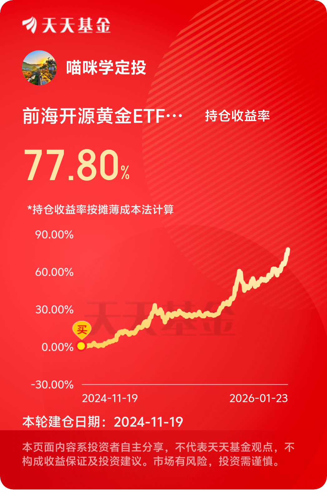 综上,2025年黄金的亮眼表现印证了其作为核心配置资产的价值,2026年在多重利好支撑下,黄金的底仓配置地位依旧稳固。$前海开源黄金ETF联接C$以低门槛、低费率、高适配的特质,成为普通投资者布局黄金底仓的优质工具,在资产配置多元化的趋势下,这款基金能帮助投资者轻松把握黄金投资机遇,让黄金的避险与保值价值,成为资产组合穿越市场周期的坚实支撑。