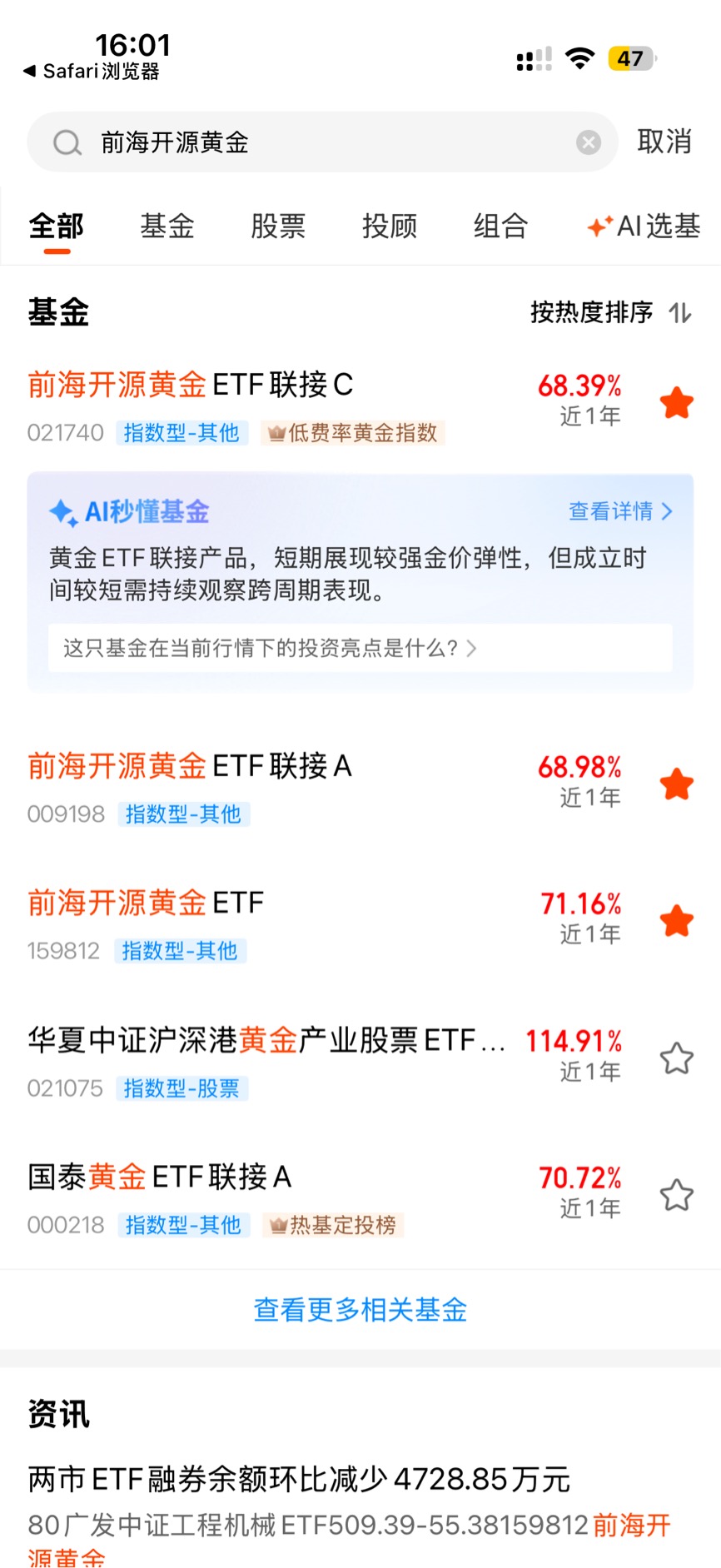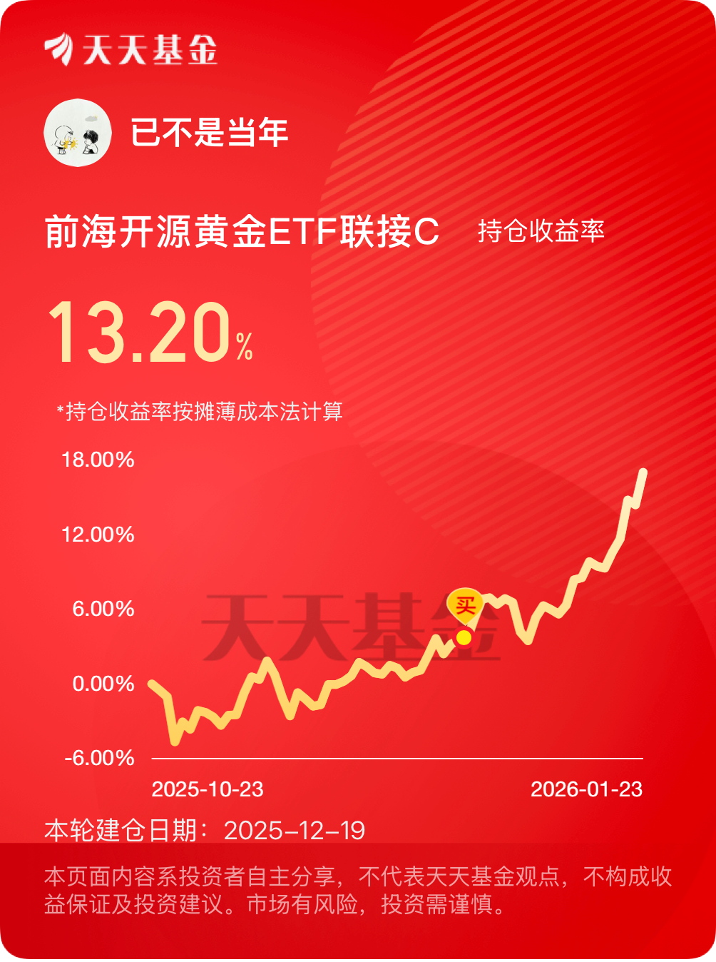 我自己就是从去年底开始,用定投的方式,慢慢买入一些黄金资产。我选择的是前海开源黄金ETF联接基金。对我来说,这样操作省心不少。它直接跟踪的是上海黄金交易所Au9999现货实盘合约的价格走势,等于我通过基金份额间接持有了实物黄金,不用操心真金的储存、保管和鉴定这些麻烦事。在账户里,它就像买卖普通基金一样方便,10块钱就能起投,流动性很好。