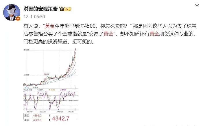 可是,金价屡创新高,很多投资者却屡次踏空,这又是为什么?说起来无非是两个心魔在作祟。第一是总想预测趋势,躲过下跌。比如,李蓓清仓黄金,原因之一是俄罗斯央行在抛售;洪灏认为黄金高估,已经出现了泡沫;而付鹏认为,推动黄金牛市的因素,比如地缘政治紧张、世界秩序不稳定等正在消退。结果呢?金价没多久就掉头向上,并接连突破前高。因为这轮上涨里,混入了太多无法预测的突发风险事件,试图精准预判这些,本身就超出了大多数人的能力圈。第二是总想找到那个“完美”的买点,一把梭哈,吃尽所有涨幅。事后看,任何时候买入似乎都是对的,但站在当时,眼前全是迷雾:地缘局势会不会突然缓和?央行购金节奏会不会放缓?各种声音都在制造不确定性,让人下不去重手。结果就是,在犹豫和等待中,眼睁睁看着车开走。