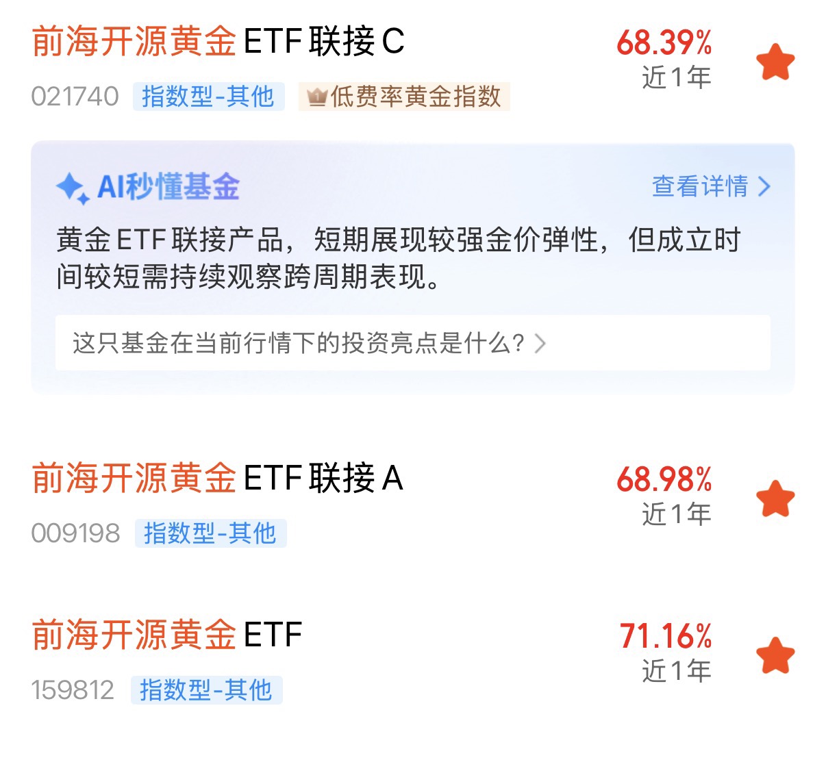 我自己选择的是前海开源黄金ETF联接基金(A类代码:009198,C类代码:021740)。它是一只跟踪前海开源黄金ETF(159812)的基金,而ETF本身紧密跟踪上海黄金交易所AU9999现货合约的价格。这相当于大家凑钱,通过基金间接持有了真实的黄金资产,既享受金价上涨的收益,又免去了保管、鉴定、变现的种种麻烦。
