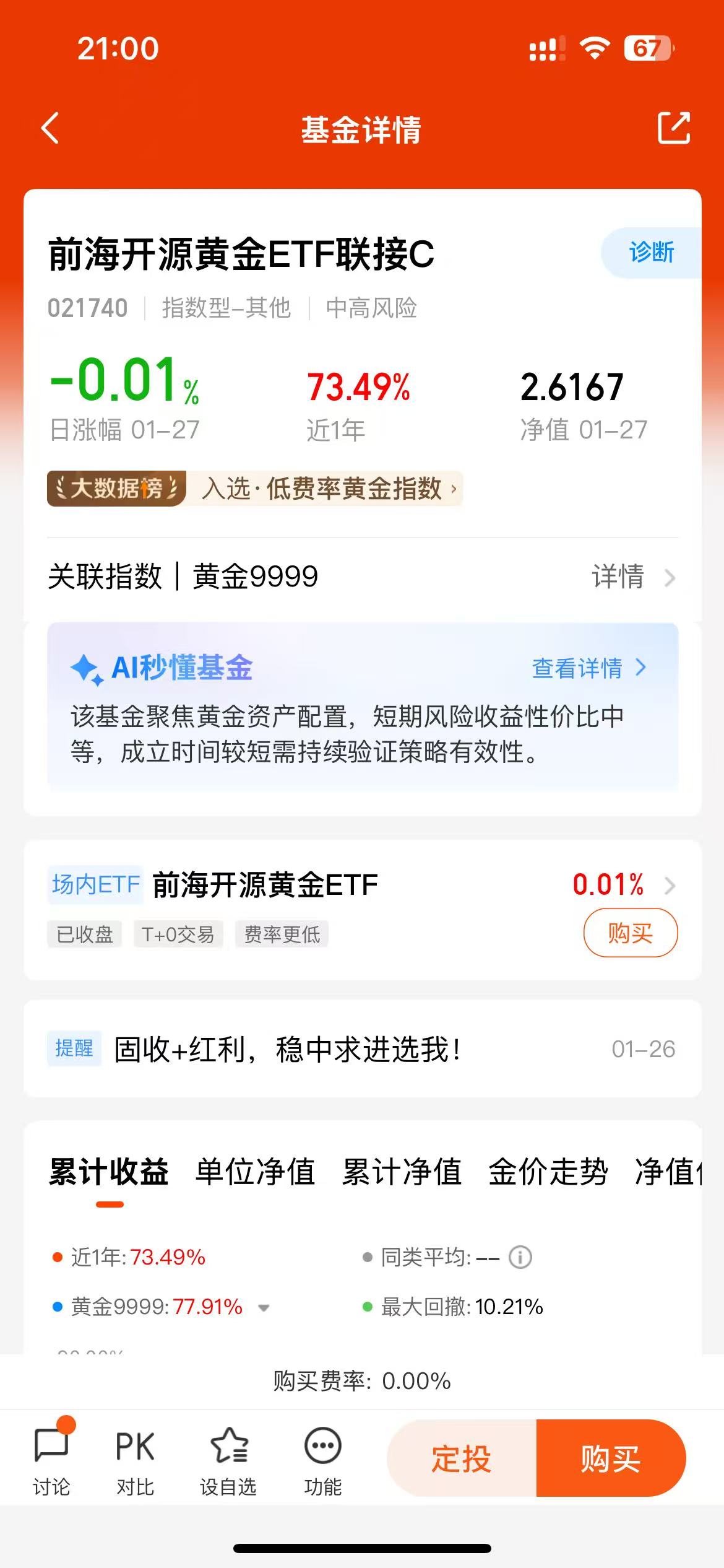 投资门槛低:相比于直接投资实物黄金,前海开源黄金ETF联接C基金的投资门槛较低。投资者只需少量资金即可参与黄金投资,这使得更多的普通投资者能够享受到黄金投资带来的收益和资产配置优势。无论是小额投资者还是大型机构投资者,都可以根据自身的资金状况和投资目标,合理配置该基金。