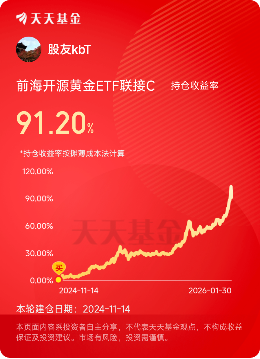 当下市场还有不少不确定性,黄金的避险和配置价值一直都在,选$前海开源黄金ETF联接C$ 做底仓,让它稳稳托住我的投资组合,剩下的部分再去布局高收益的标的,攻防兼备,这才是普通人做投资的靠谱玩法。当然了,投资都有风险,金价也会有短期波动,要结合自己的风险承受能力配置,长期持有才能发挥底仓的最大价值。@前海开源基金 #晒收益#