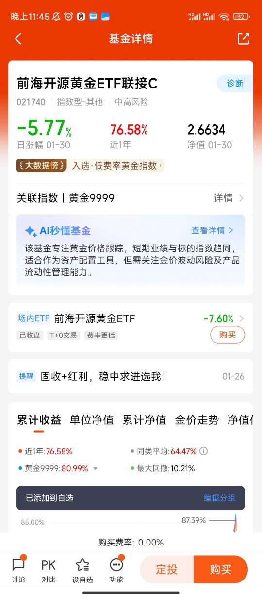 选择标的:前海开源黄金ETF联接C(021740)