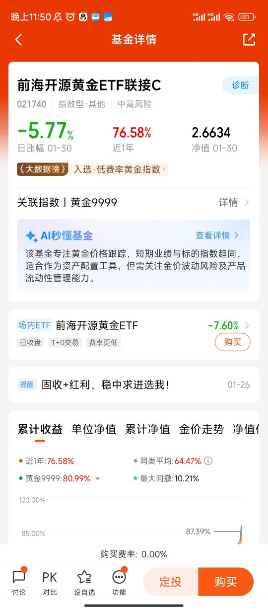 第二,当前宏观周期利好黄金长期表现。2026年美联储降息周期开启、全球央行持续购金、美元信用体系面临重构,这些核心驱动力支撑黄金中长期走强。虽然短期金价波动较大,但作为底仓资产,我们追求的是3-5年的战略配置价值,而非短期择时。该基金成立以来(2024年6月成立)收益超100%,虽不代表未来表现,但反映了黄金资产在当前周期的配置价值。