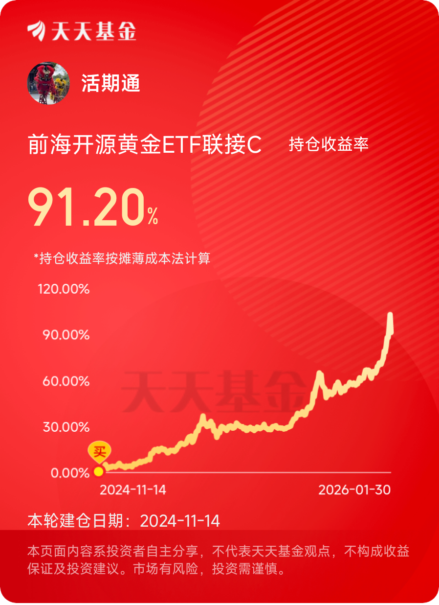 投资的核心是长期稳健,而黄金就是那个能给稳健托底的资产。它不会让你一夜暴富,但能在市场动荡时守住本金,在通胀来临时保住购买力,还能平衡组合风险,让你在投资路上走得更稳、更踏实。对于咱们普通投资者来说,选黄金做底仓,真的是一个省心又靠谱的选择,毕竟投资,先求稳,再求赚,才是长久之道。@前海开源基金 #晒收益#