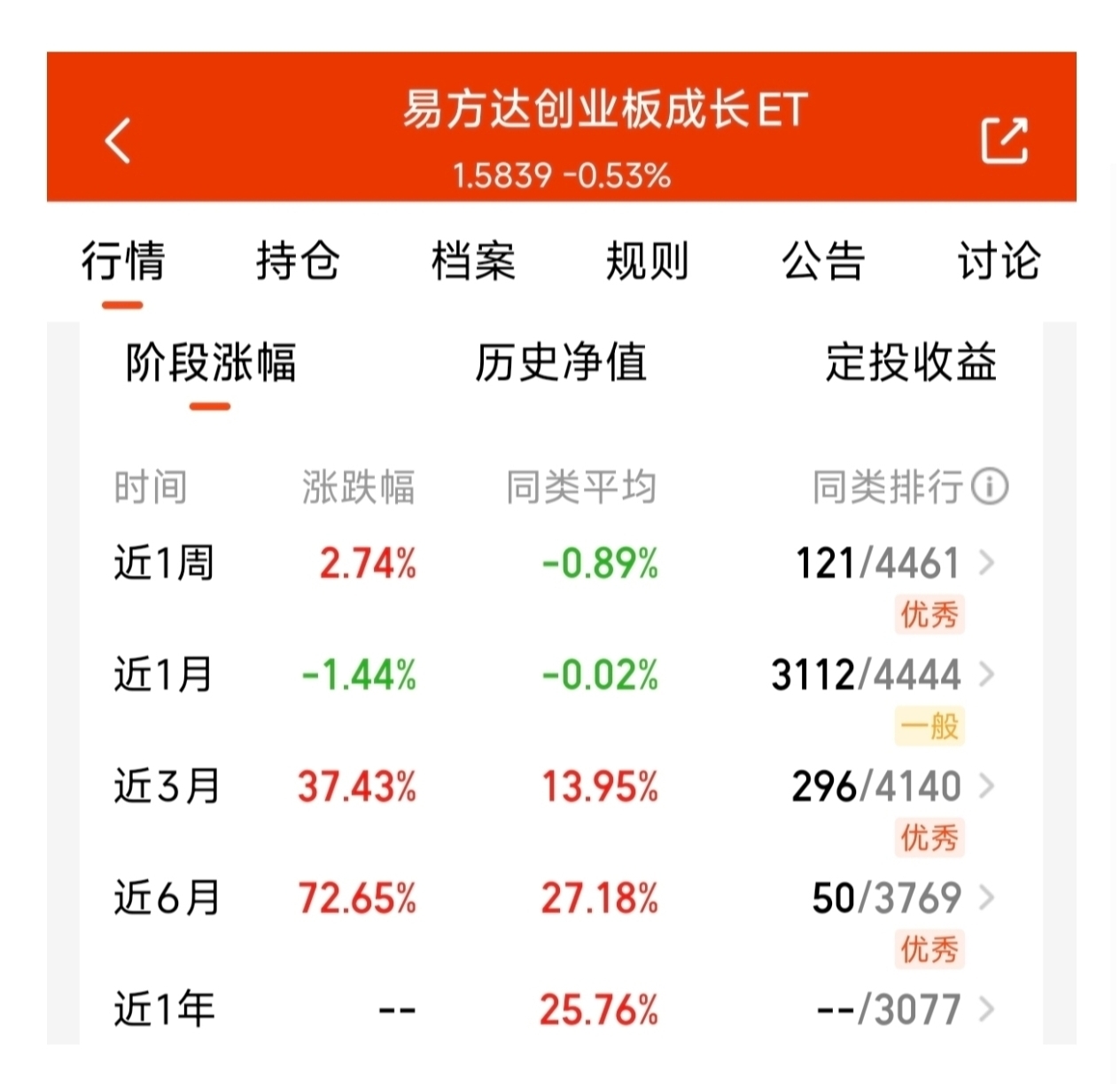 最近市场虽然还在调整,但感觉下跌的力度明显减弱了。我注意到$易方达创业板成长ETF联接发起式C$ 这只基金表现挺亮眼的,最近三个月涨了37%多,半年涨幅更是超过了72%,比创业板指数本身跑得更好。