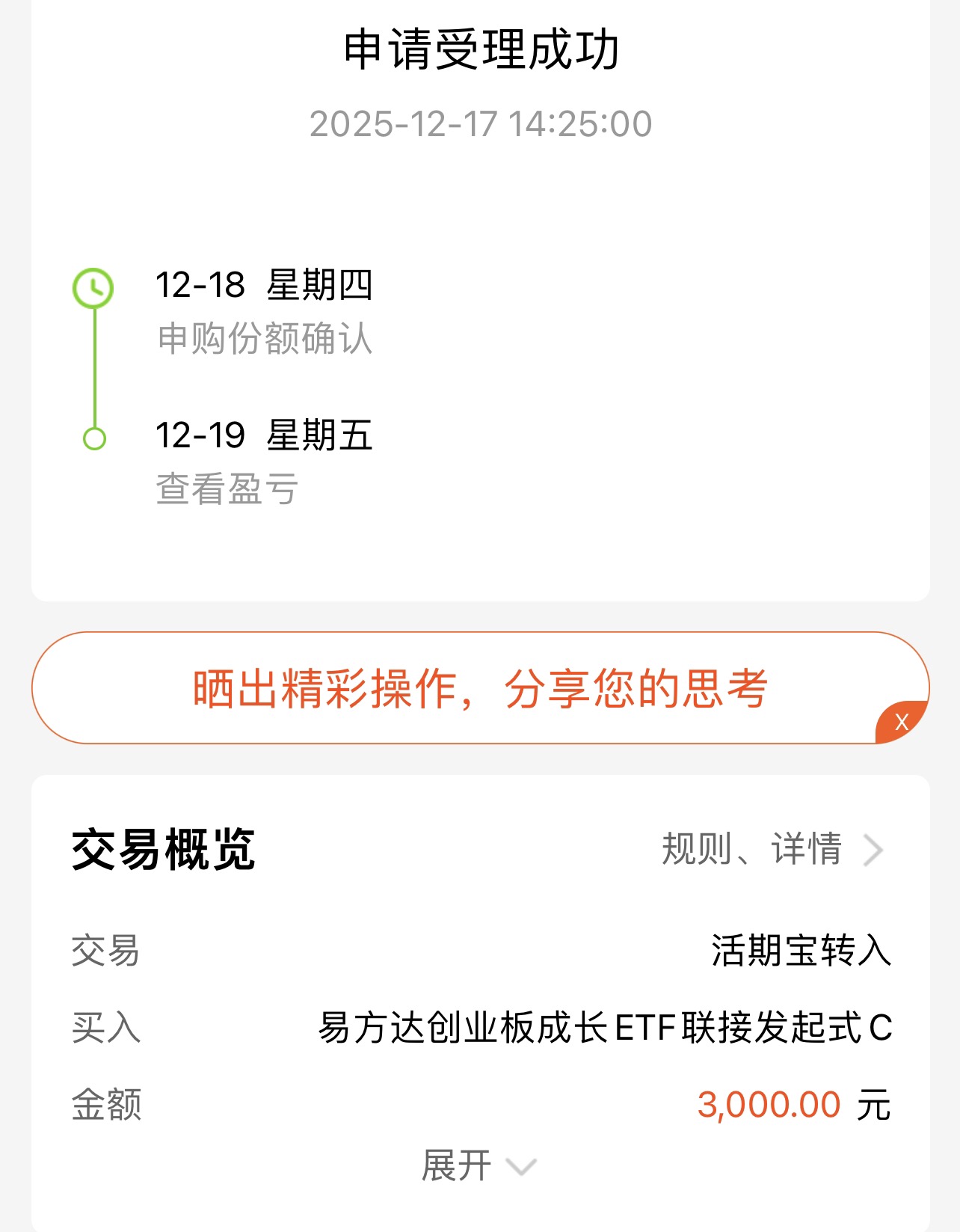 今天创业板情绪明显回暖,成长风格再度占优,创业板成长指数的涨幅明显跑赢创业50和创业板指,强势特征很清晰。高景气赛道一反弹,资金优先选择弹性更高的方向。创业板成长聚焦宁德时代等高成长白马,兼顾景气度和成长性,近1年业绩优势也很突出。趁着情绪回暖,我买入3000元易方达创业板成长ETF联接C,正式布局跟踪成长主线。