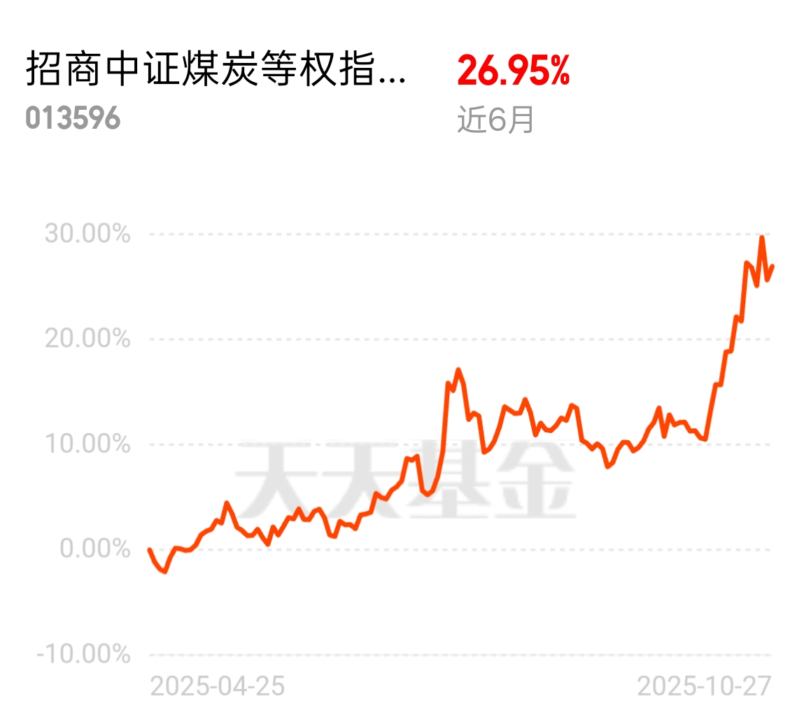 煤炭板块跌超1%,别怕顶。旺季初,支撑足。招商中证煤炭等权指数C近6个月26.9