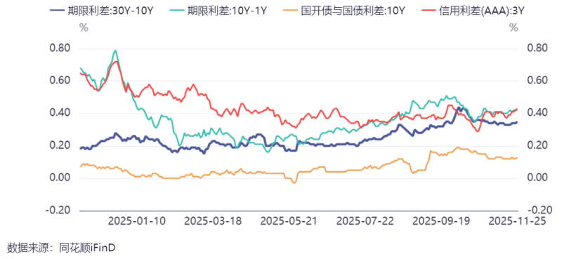 债市今天持续走弱,尾盘有所拉升,目前十年期国债活跃券收益率上行近2BP,波动幅度为近一个月最大。国债期货全线回调,利率债长端调整幅度较大,信用债局部坚挺,不过也还是跌多涨少了。期限利差变化不大,信用利差延续走阔。