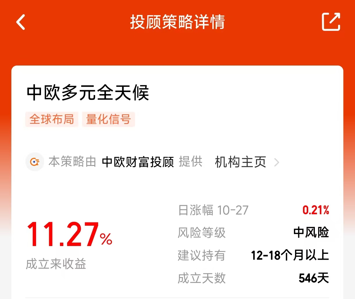 市场越热闹,越要警惕收益的来源是否可持续。我发现中欧多元全天候不依赖单一资产博收益,而是通过固收打底,叠加全球多资产增强,即使某类资产熄火,其他类别也能弥补。近一年数据很说明问题:收益9.42%,最大回撤2.02%,波动率2.75%。这种策略背后是严格的波动率控制和资产再平衡机制,比如会根据市场变化调整美股、黄金等仓位比例。对于希望规避单一市场风险的投资者,这种全天候思路提供了另一种可能——不追求尖峰收益,但求长期安稳。#科技热点摊开业啦#