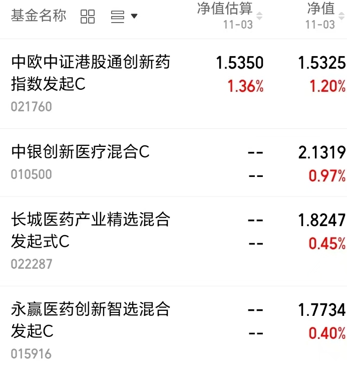 $中欧中证港股通创新药指数发起C(OTCFUND|021760)$上涨1.2%;