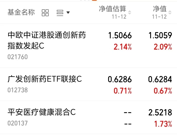 $中欧中证港股通创新药指数发起C(OTCFUND|021760)$今天上涨2.09%;