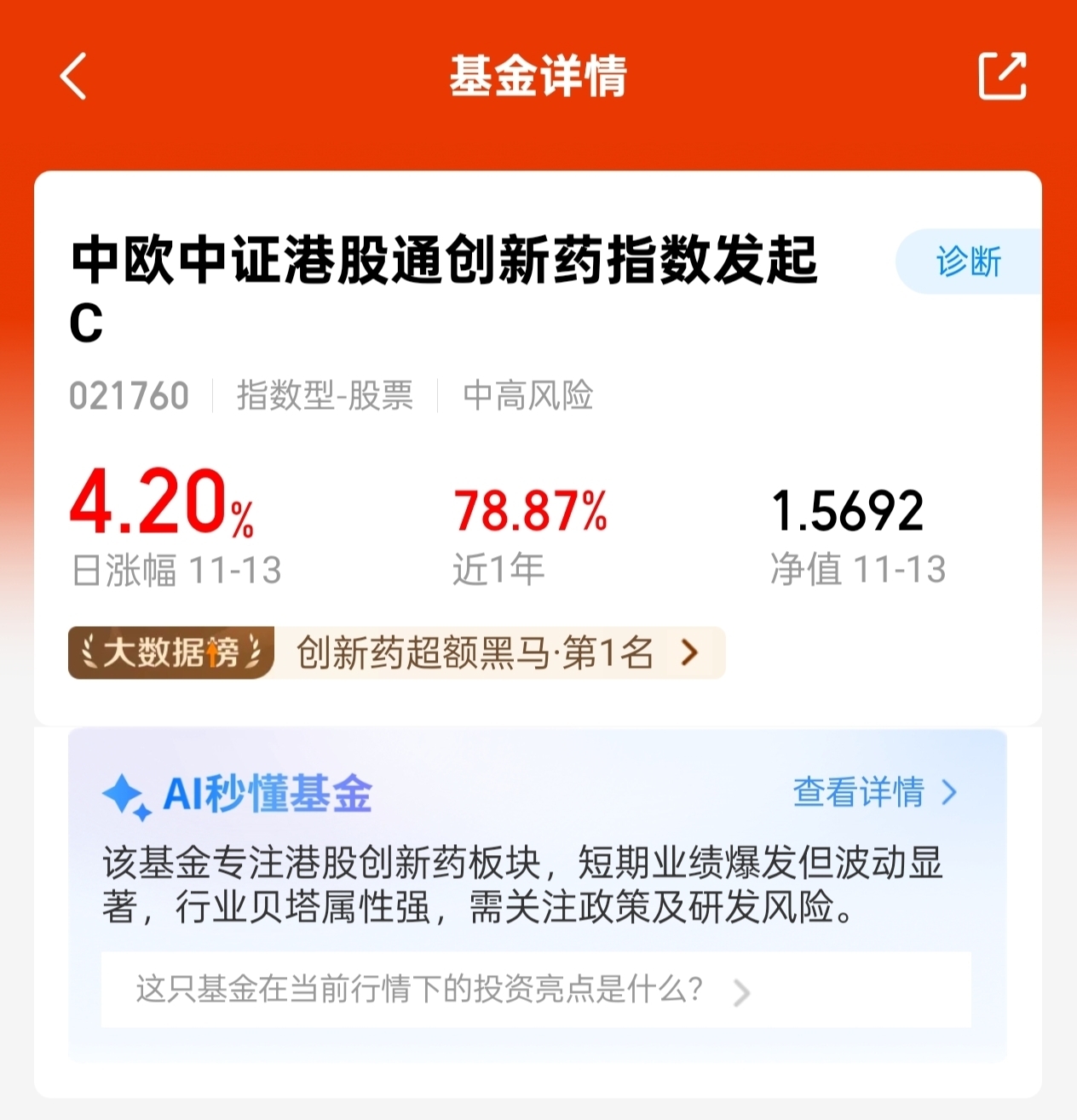 中欧中证港股通创新药指数发起C(OTCFUND|021760)大涨4.2%,港股创新药表现尤其亮眼;