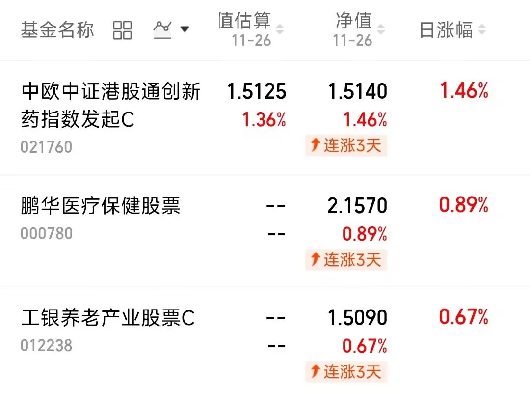 医药板块反弹的逻辑超跌反弹,靠着题材的强劲拉升带动各个板块做多情绪,尤其是创新药方向拉升的力度还是很不错的,相关基金今天继续有所表现,$中欧中证港股通创新药指数发起C(OTCFUND|021760)$上涨1.46%,$鹏华医疗保健股票(OTCFUND|000780)$上涨0.89%,$工银养老产业股票C(OTCFUND|012238)$上涨0.67%。