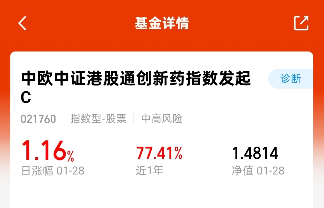 中欧中证港股通创新药指数发起C,涨1.16%,近1年涨幅达77.41%,基金紧密