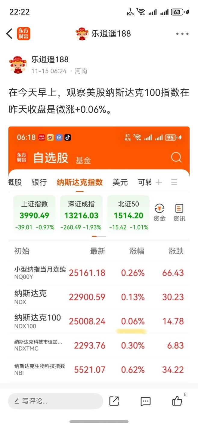 记得在上周六那天早上的时候,观察美股纳斯达克100指数,在上周五那天收盘是微涨+0.06%的。