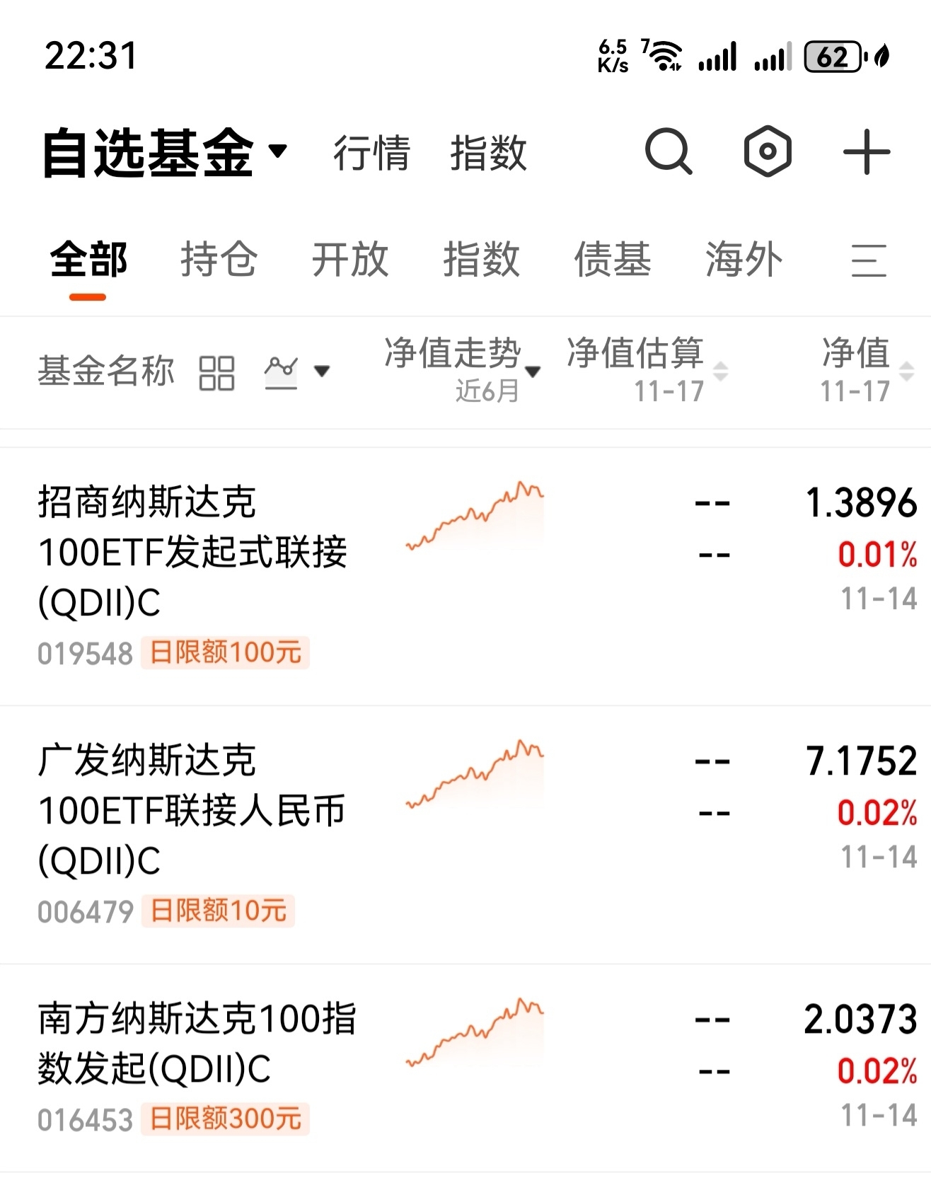 在今天晚上的时候,也观察了在以前买过某几个美股纳斯达克100指数qdll基金,在今天晚上更新上周五那天的实际表现,还可以分别收一两个蛋的。