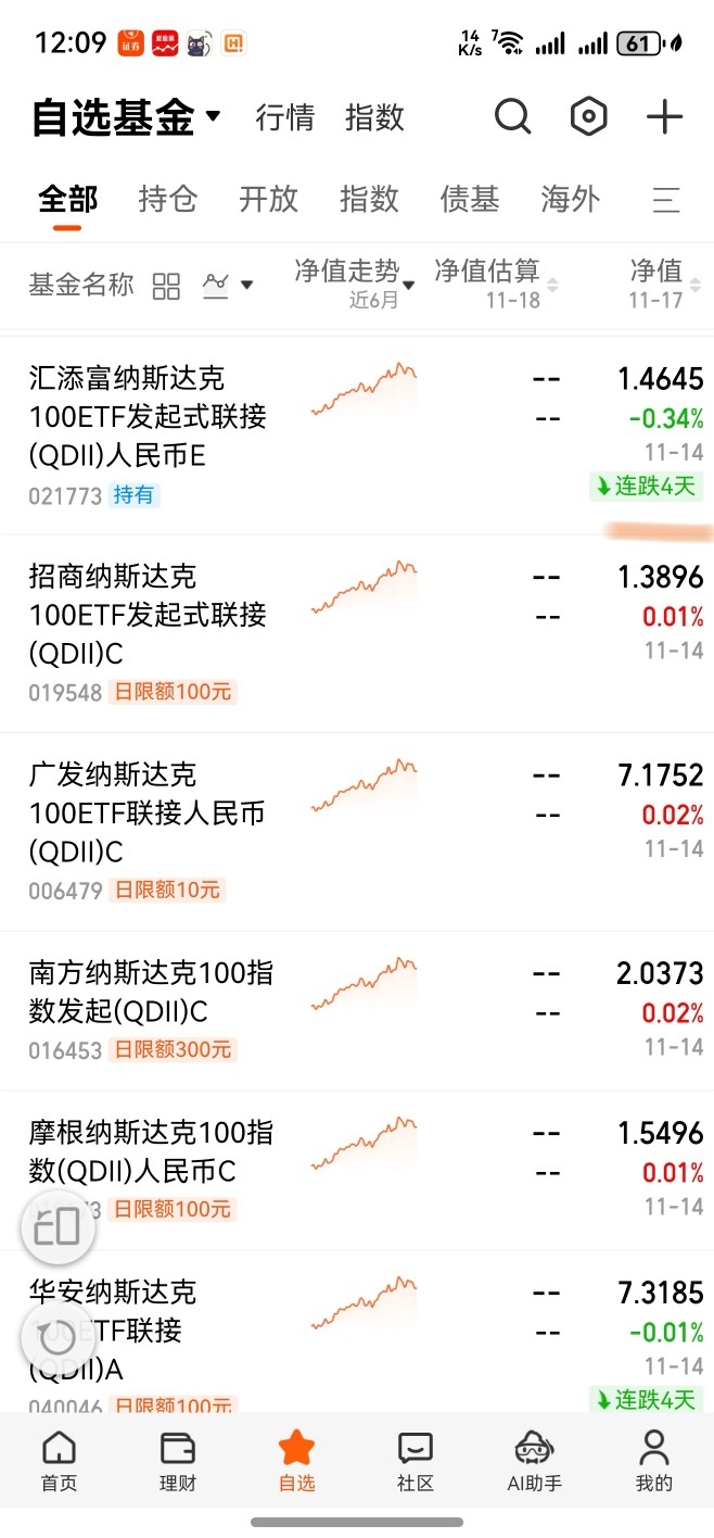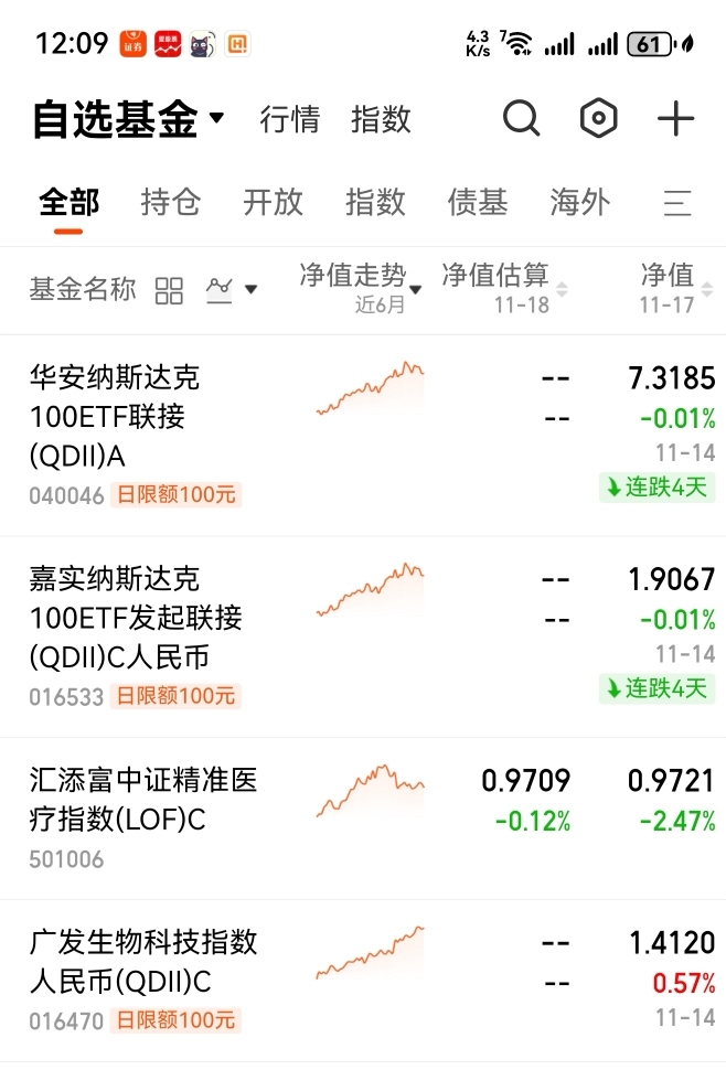 在昨天晚上的时候,与在今天上午的时候,观察以前买的某些个美股纳斯达克100指数qdll基金,在昨天晚上更新上周五那天的实际表现,都是分别是收一两个蛋、与碎一个蛋的表现的。
