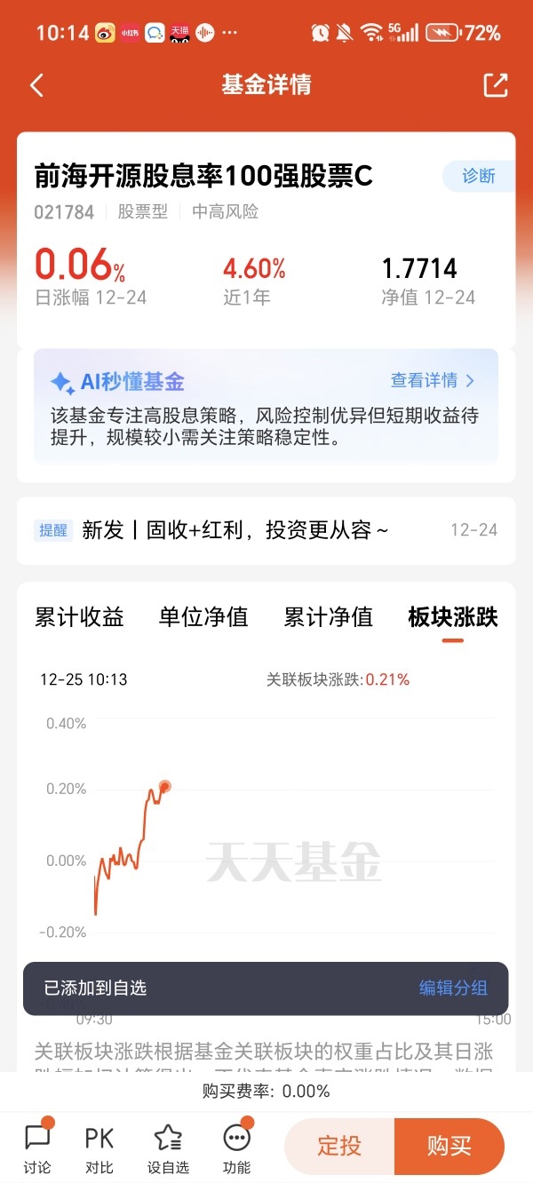 #前海开源红利家族# 果断把前海开源股息率100强股票C加入自选,对于没时间盯盘选股、又想布局红利赛道的投资者来说,这只一键布局高分红企业的基金,无疑是省心省力的优质选择。这只基精准筛选A股100家高分红优质企业,基金经理严格把关,入选标的均满足连续分红、股息率达标、基本面稳健、盈利持续稳定等核心条件,不用自己挨个研究个股,不用担心中踩雷,一键就能实现高股息资产的分散布局,有效降低单一标的风险。从持仓来看,这只基行业分布均衡合理,涵盖银行、煤炭、交运、消费等多个高股息板块,不单一押注某个赛道,进一步筑牢稳健根基,近一年在市场震荡行情中波动远低于同类偏股基金,净值走势平稳向上。当下市场环境中,赚快钱难度越来越大,确定性收益才是核心追求,高股息资产既能稳稳获取持续分红现金流,分红再投还能享受复利增值,股价长期稳健上涨还能额外赚取价差收益,双重收益加持下性价比拉满。红利资产当下正是绝佳配置窗口期,这只股息率100强基金门槛低、操作省心、稳健性强,是新手入门红利赛道、老手加仓稳健仓位的优质选择,长期持有下来,就能收获稳稳的复利收益。