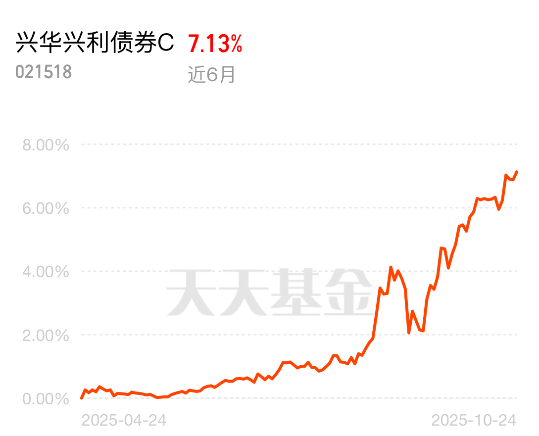$兴华兴利债券C$ 有个挺特别的策略,就是 “固收打底、权益增强”,能巧妙利用股票和债券的互补性。上周收了 111 个 “蛋”,不管市场怎么样都能灵活调整,涨的时候能跟上,跌的时候抗跌性也强。