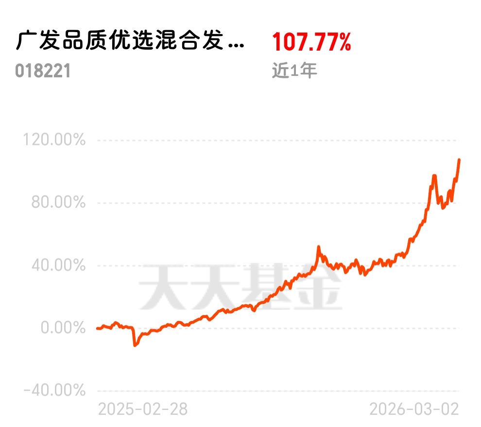 有机构复盘了1973年第四次中东战争,当时油价从2.5美元飙到12美元,金价跟着暴涨。1979年伊朗革命,金价从217美元干到850美元。历史不会简单重复,但韵脚惊人相似。这次美以直接介入伊朗,烈度远超去年。我手里的广发品质优选混合发起式C 最近这波走势真有点主升浪的意思,今天又涨4.04%,拿着这种有硬核逻辑的基金,晚上睡觉都踏实,不用天天担心黑天鹅。