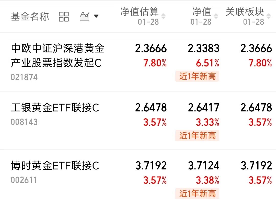 顺周期板块大多跟风国际现货、期货市场走势,基本面的支撑并不扎实,目前这类板块已经走出加速上涨的形态,走势偏资金推动。$中欧中证沪深港黄金产业股票指数发起C(OTCFUND|021874)$上涨6.51%,$工银黄金ETF联接C(OTCFUND|008143)$上涨3.33%,$博时黄金ETF联接C(OTCFUND|002611)$上涨3.38%。