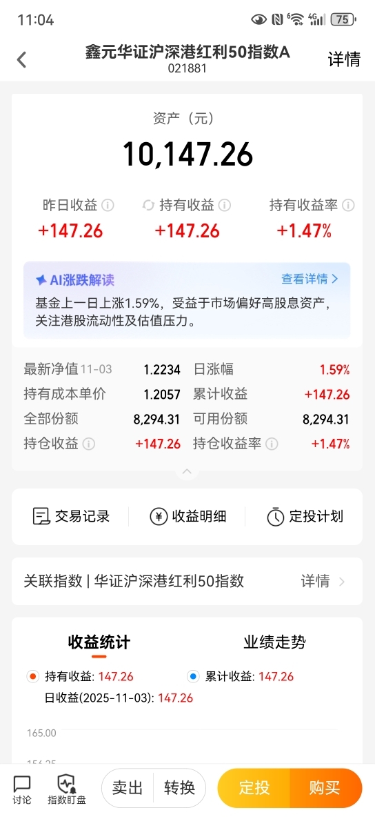 买的第一天就赚了1.5%!!红利真的回来了$鑫元华证沪深港红利50指数A$