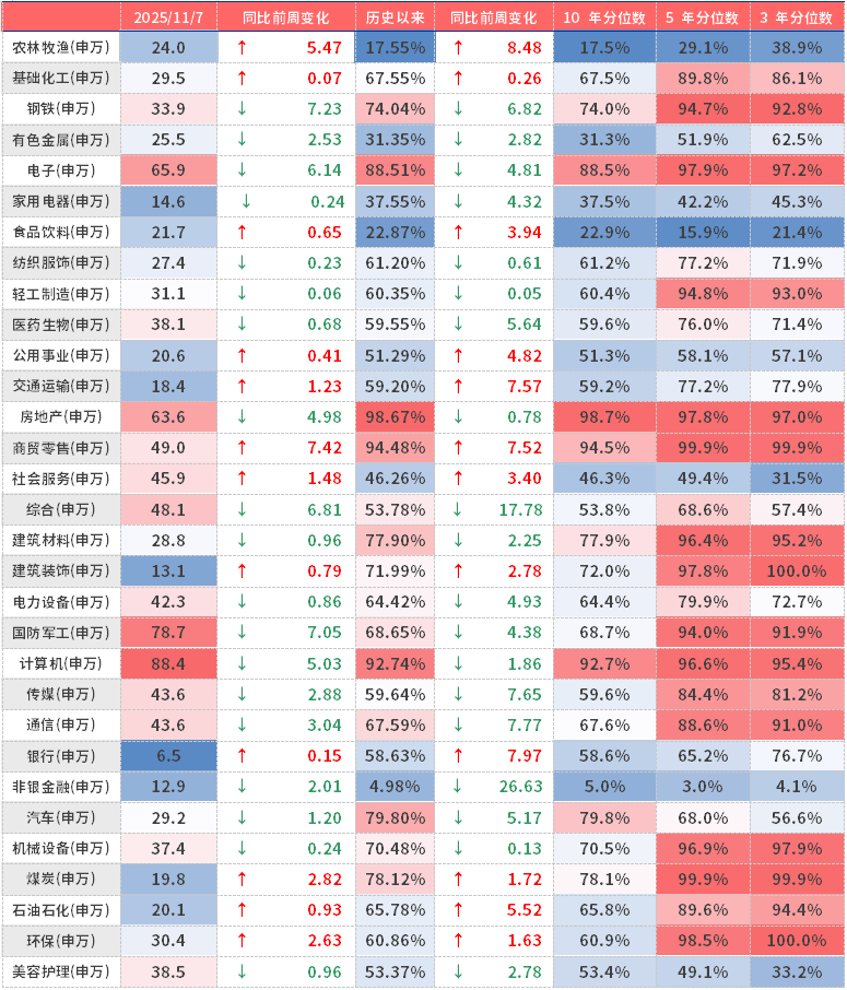 11月6日,两融资金占比为11.26%,10月31日为10.82%,反映出杠杆资金加仓意愿略有提升。截至11月7日,本周融资净买入的前三行业为电力设备、医药生物、基础化工。