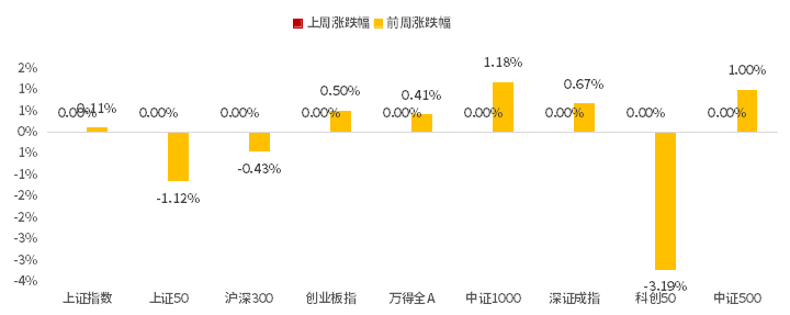 本周A股宽基指数多数上涨。截至11月7日,上证指数上涨1.08%、上证50上涨0.89%、沪深300上涨0.82%,涨幅居前。从行业板块看,本周电力设备、煤炭、石油石化领涨,美容护理、计算机、医药生物领跌。