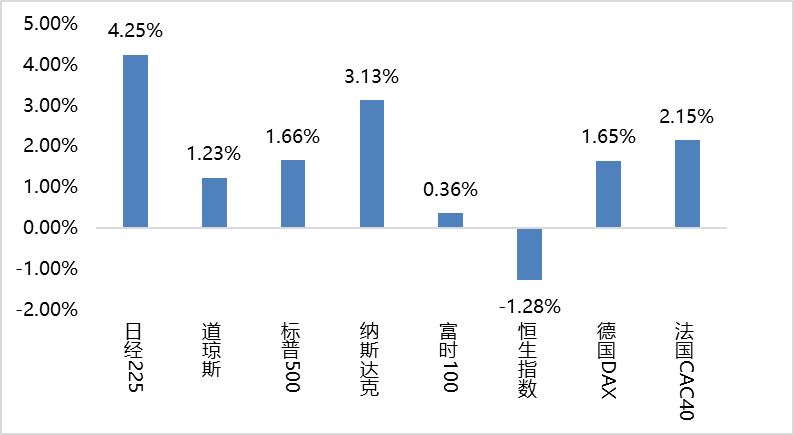 本周海外股市集体上涨。美国股市方面,道指上涨1.23%,标普500上涨1.66%,纳指上涨3.13%;欧洲股市方面,英国富时100上涨0.36%,德国上涨1.65%,法国上涨2.15%;亚太股市方面,日经指数上涨4.25%,恒生指数下跌1.28%。