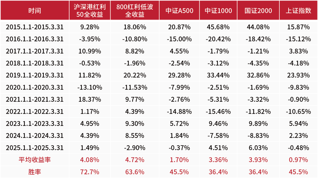 从2015年到2025年,上证指数一季度正收益胜率有45.5%,接近一半。800红利低波、沪深港红利50等红利指数的胜率更是超过60%-70%。这说明一季度“春季躁动”仍在,但它已换上“红利”的新装。“躁动”的资金不再盲目追逐高风险增长,而是更青睐盈利稳定、现金流充沛的红利资产。