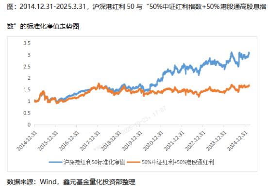 基于沪深港红利50指数的编制方法,其长期配置效果不等同于简单的“一半A股红利+一半港股通红利”。我们回溯过去十年数据,以中证红利(000922)代表A股红利,以港股通高股息(930915)代表港股红利,从2014.12.31到2025.3.31期间沪深港红利50的累计收益率为204%,“一半中证红利+一半港股通红利”的累计收益率为65%,前者具有长期明显的超额收益。