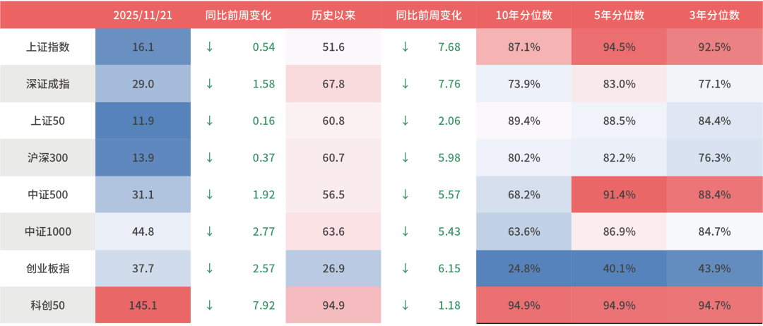 上周A股宽基指数多数下跌。截至11月21日,创业板指下跌6.15%、中证1000下跌5.8%、中证500下跌5.78%,跌幅居前。从行业板块看,上周电力设备、综合、基础化工领跌。