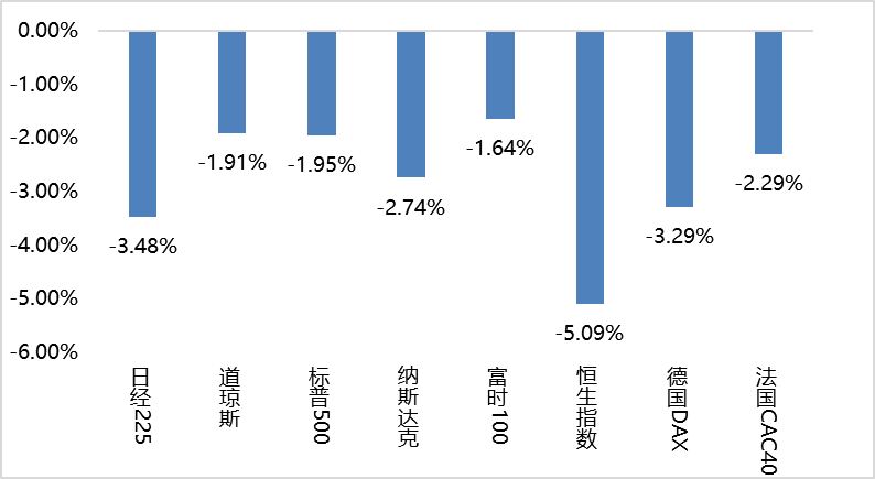 上周海外股市集体下跌。美国股市方面,道指下跌1.91%,标普500下跌1.95%,纳指下跌2.74%;欧洲股市方面,英国富时100下跌1.64%,德国下跌3.29%,法国下跌2.29%;亚太股市方面,日经指数下跌3.48%,恒生指数下跌5.09%。
