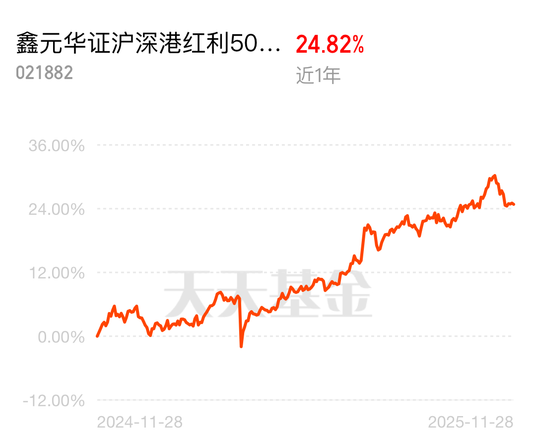 $鑫元华证沪深港红利50指数C$ 的涨幅属实给力,近一年24.82%的收益,中长期拿着还是挺靠谱的。