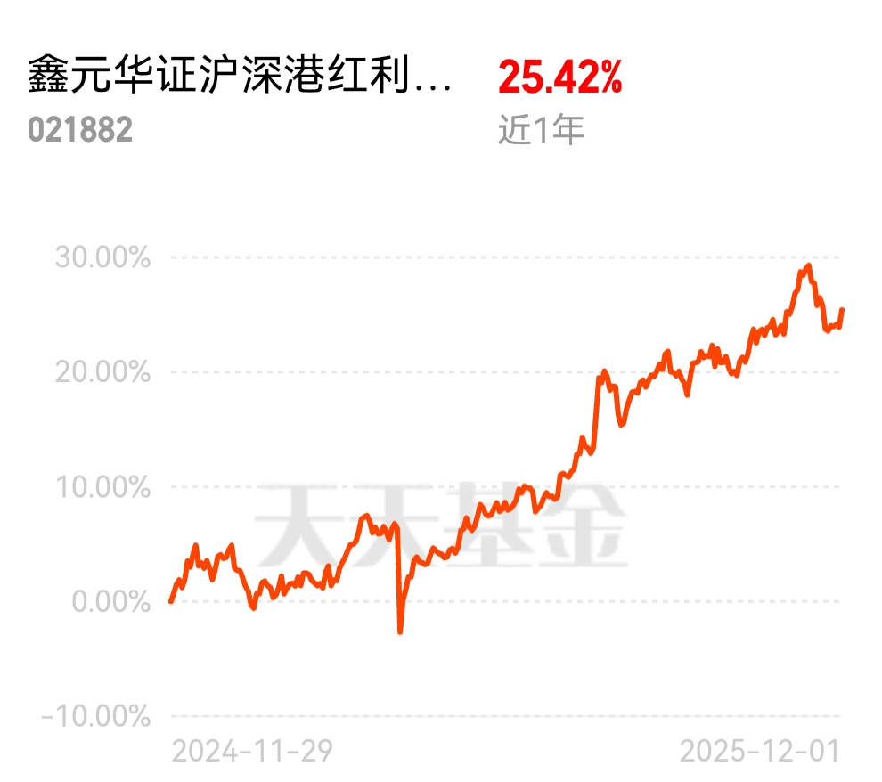 今天权益市场震荡了,红利压舱石继续上涨$鑫元华证沪深港红利50指数C$ 近一年涨25.42%,平均股息率超7%,抗波动还能赚收益,长期持有性价比拉满。