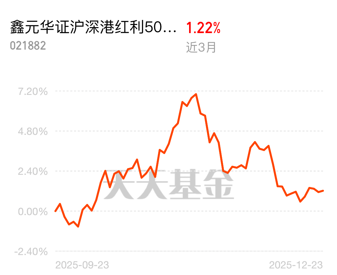$鑫元华证沪深港红利50指数C$ 单日上涨0.08%,近3月收获1.22%收益,聚焦能源、工业等红利赛道,防御性拉满~