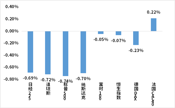 本周海外股市多数下跌。美国股市方面,道指下跌0.72%,标普500下跌0.74%,纳指下跌0.70%;欧洲股市方面,英国富时100下跌0.05%,德国下跌0.23%,法国上涨0.22%;亚太股市方面,日经指数下跌0.69%,恒生指数下跌0.07%。