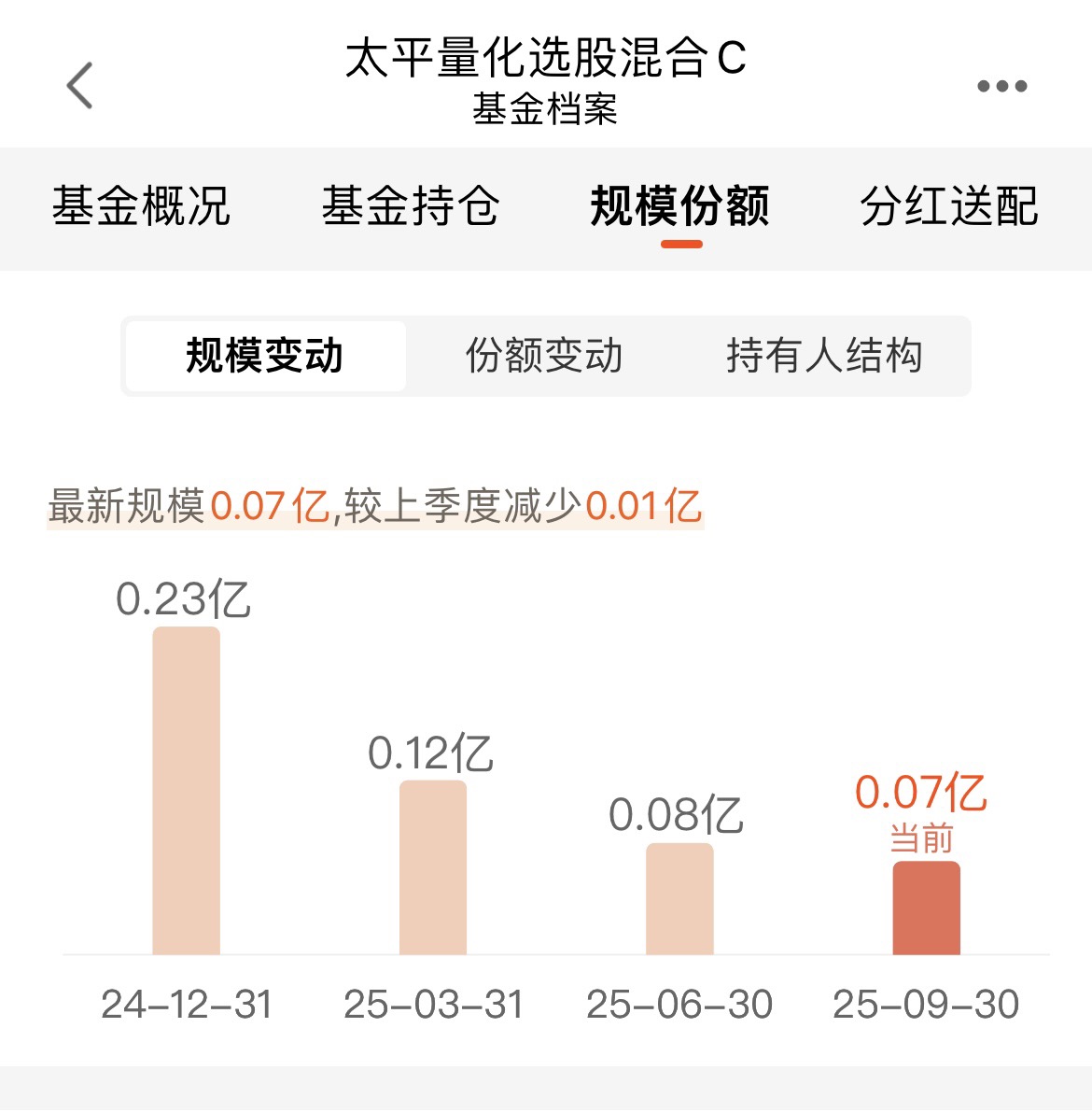 第四个让我放心的,是它那“0.07亿”的小规模反而是优势。很多人一看规模小就怕清盘,但咱得看实际情况:这基金是2024年10月才成立的,才一年多,规模小很正常;而且它现在持有人数虽然不足200户,但太平基金是央企背景,背靠财政部,不至于轻易让它清盘。更重要的是,小规模对微盘股策略太友好了——微盘股市值小、流动性差,规模大的基金根本买不进去,买一点就把股价推高了,成本蹭蹭涨;但这基金规模小,想调仓就调仓,想买哪个小票都能买到位,完全不用受“船大难掉头”的罪。等后面规模涨起来,反而可能失去现在的灵活性,所以现在上车刚好是“吃到策略红利的窗口期”。