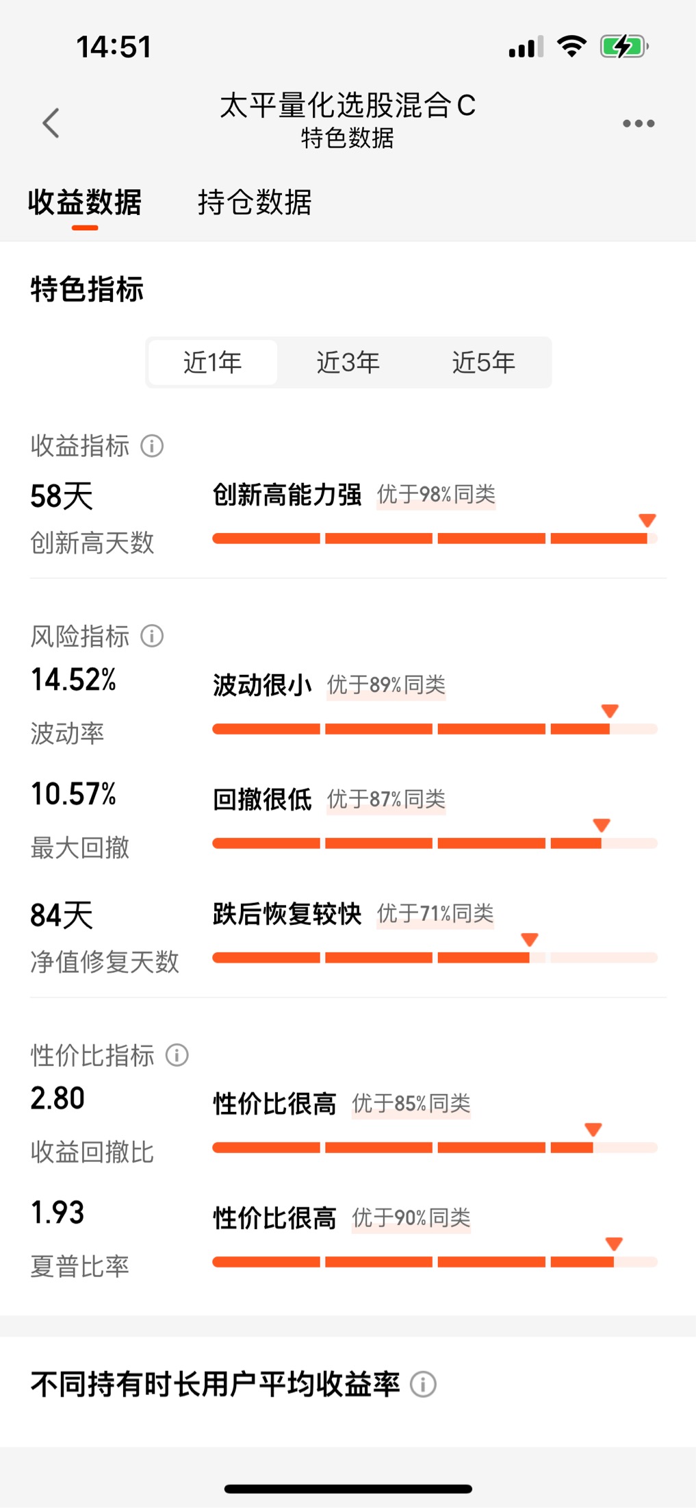 可能有人会说:“微盘股波动大,你不怕吗?”我怕啊,但我更怕“看着机会溜走”。这基金已经用“分散+量化”把波动压到最低了,近一年波动率才14.52%,比89%的同类都小,跌了也能很快涨回来——净值修复天数才84天,比71%的同类都快。而且咱买基金又不是赌一把就走,拿个一年半载的,这种“高弹性+低回撤”的组合,赚钱的概率肯定比瞎买股票高多了。