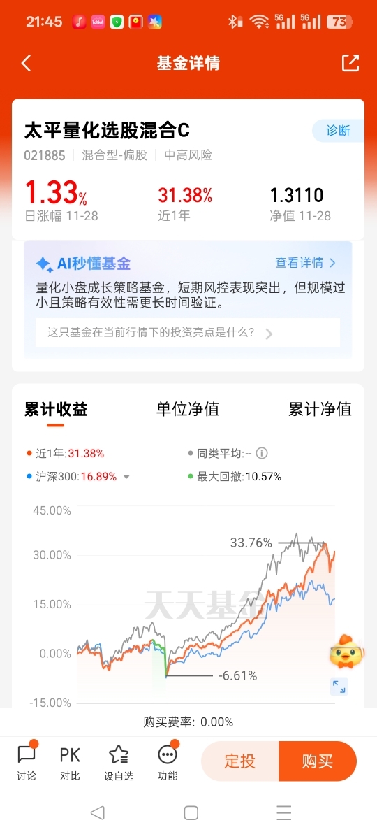 但量化也不是万能的,震荡市行情切换快,要是模型因子没及时更新,很容易失效;而且量化基金同质化挺严重,选的时候得看它的超额收益稳定性,不能光看短期业绩。对我来说,量化基金适合当 “卫星配置”,和主动管理型基金搭配,既能分散风险,又能靠模型捕捉一些我自己看不到的机会,挺适合震荡市的。$太平量化选股混合C$ @太平基金