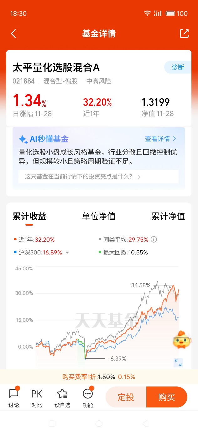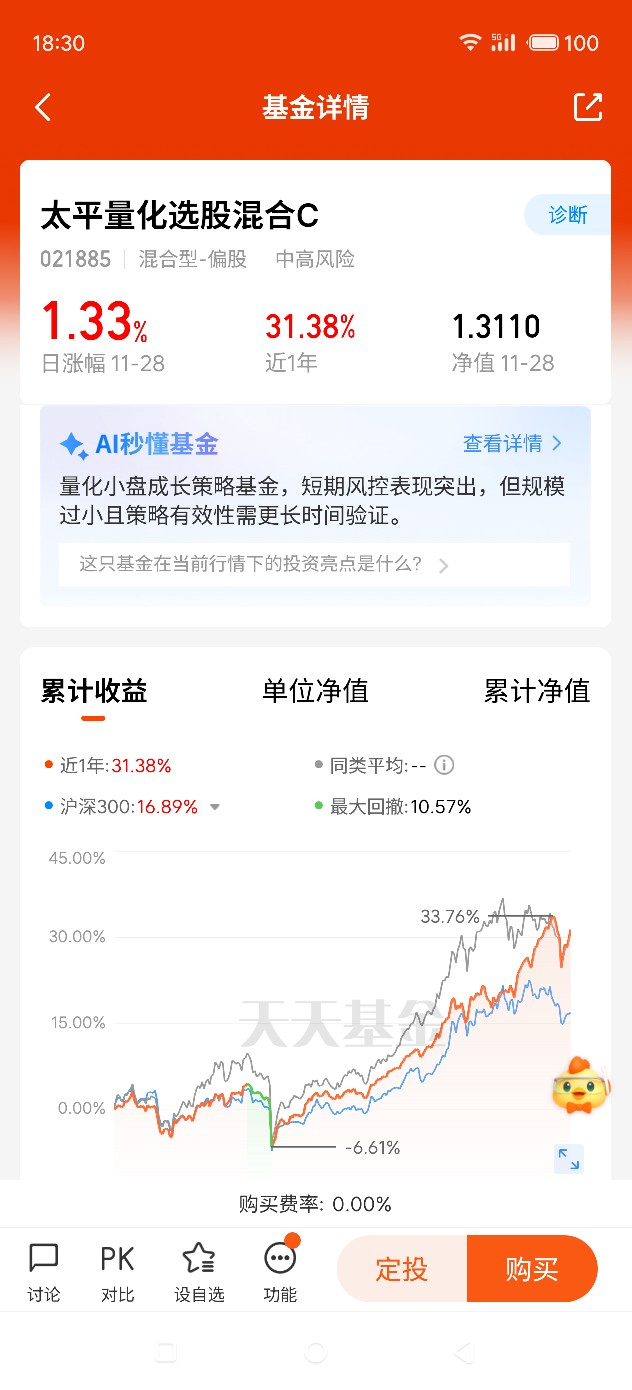 就在这次市场又开始高位震荡的时候,我反而冷静了下来,决定不再重蹈覆辙。我知道自己既没有专业的投研能力,也没有时刻盯盘的精力,想要在震荡市中稳住阵脚,定投才是最适合我的选择。确定了策略后,我开始挨个研究市面上的基金产品,从主动权益基金看到指数基金,又从行业主题基金看到量化基金,对比了近一年的业绩表现、回撤控制、策略逻辑等多个维度,最终把目光落在了太平量化选股混合C上,还果断在理财平台上建了定投计划,打算长期拿着。