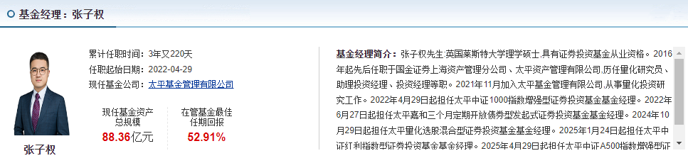 一支基金能不能长期靠谱,基金经理很关键。这支基金的基金经理张子权,是英国莱斯特大学的理学硕士,从业快十年了,不仅做过量化研究员,还管过指数增强基金、债基,横跨量化、指数、债券多个领域,经验特别全面。这种多元背景的基金经理,在做量化投资的时候,不会只盯着单一数据,反而能兼顾风险和收益,比如在控制组合波动的同时,更精准地挖掘超额收益,这也是我放心把钱交给它的原因。