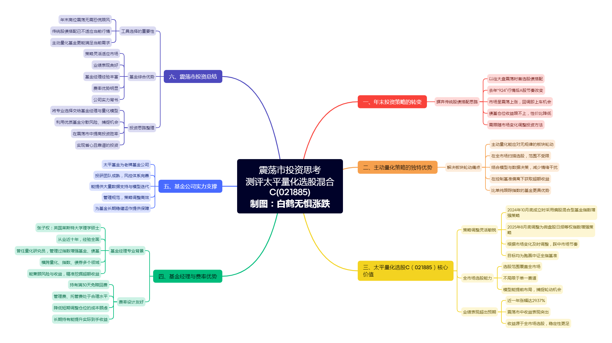 接下来白鹤君就跟大家具体聊聊自己应对震荡市的经历以及对于主动量化策略的理解,并深度测评下太平量化选股混合C(021885),文章有点长,这里也是做了个思维导图,方便大家整理思路,可以点开放大了看下的。