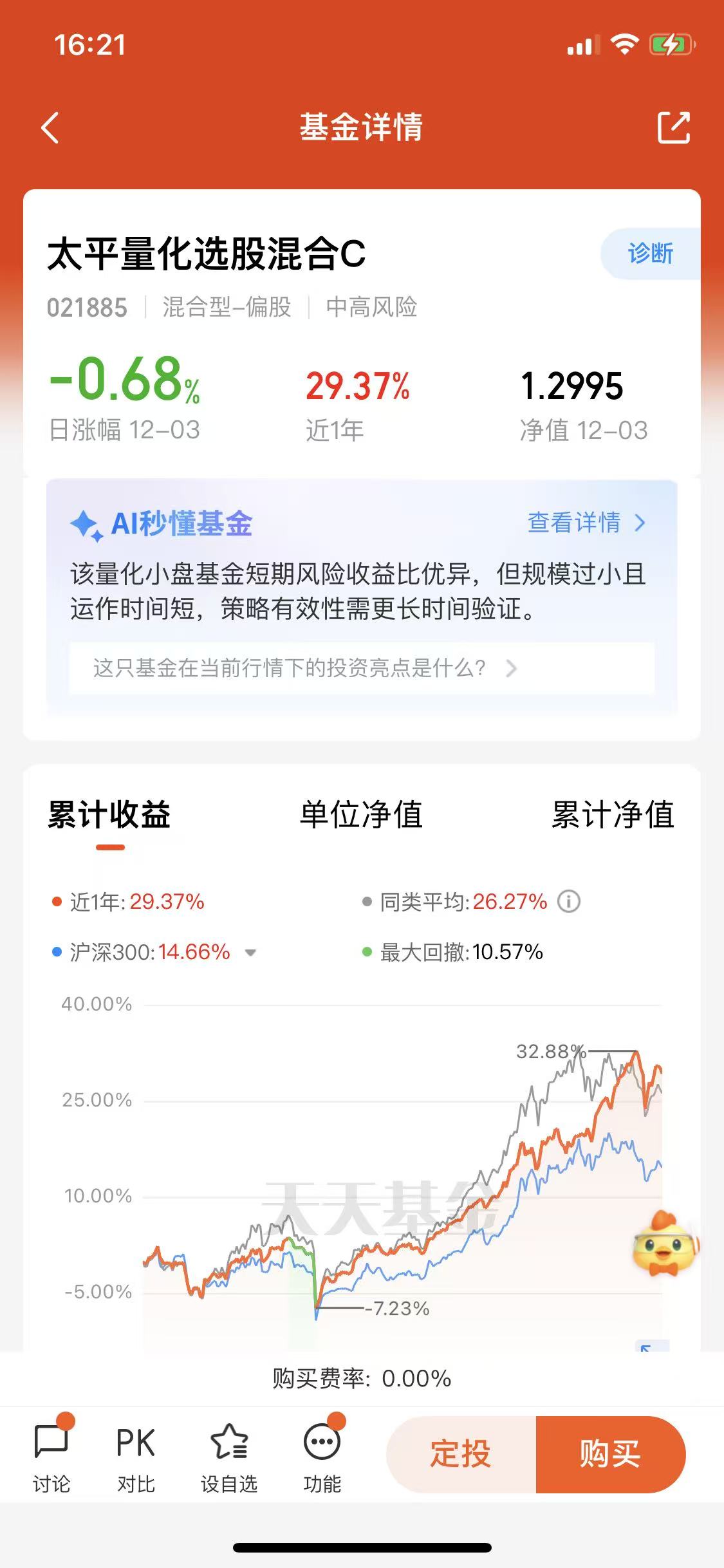 临近年末,市场开始高位震荡,我们要做的除了稳住心态外,更应该分散布局。毕竟我们无法预知板块的轮动。考虑到时间成本,我觉得利用一些主动量化策略的基金进行布局是一个较好的选择,比如太平量化选股混合C(021885)。