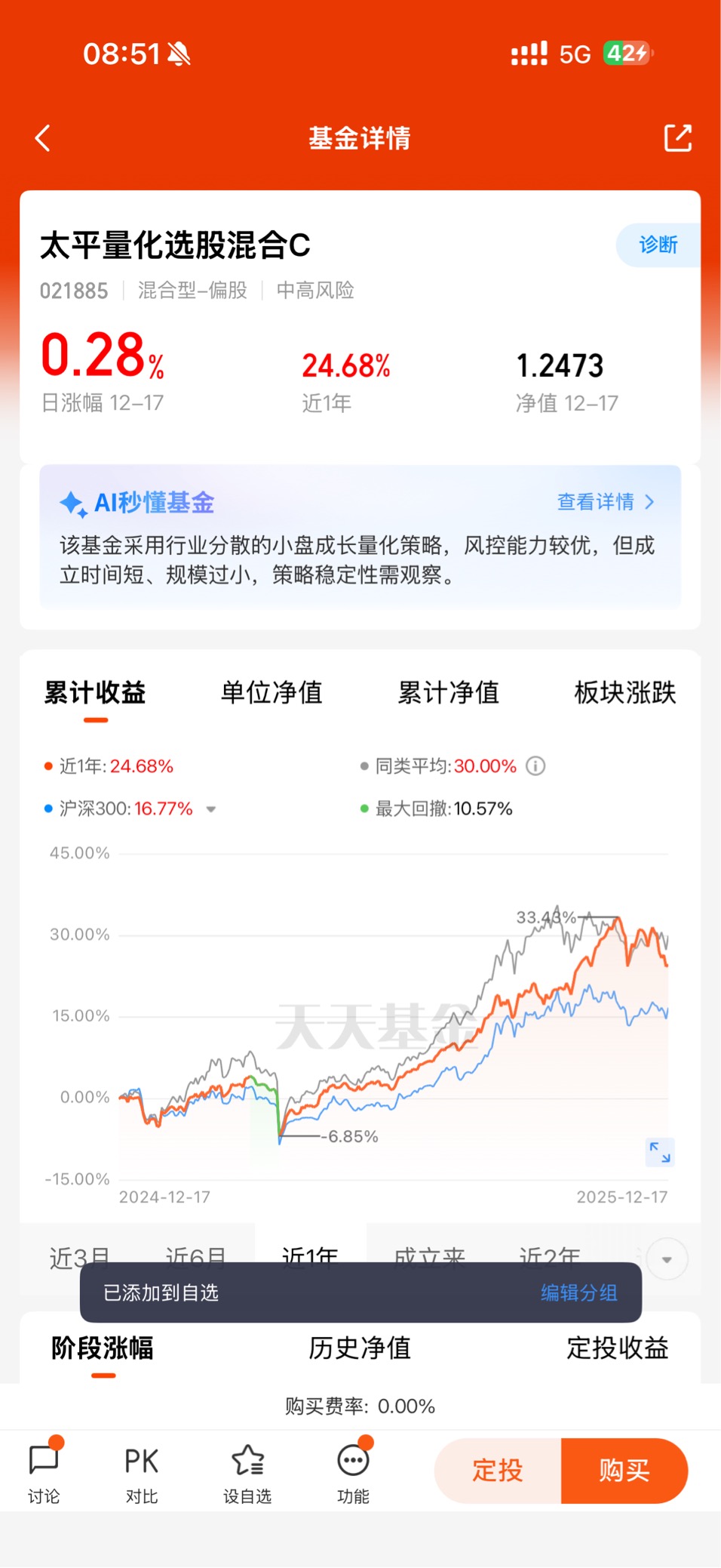还记得去年这个时候,大盘也是类似的高位震荡行情,我跟风追了几只热门赛道的主动基金,结果市场风格一转,单周回撤就超过5%,割肉舍不得,持有又心慌。也是那次教训,让我开始关注量化基金——毕竟量化选股靠模型不靠情绪,纪律性更强,在震荡市中或许更有优势。抱着试试的心态,我入手了太平量化选股混合C,没想到这一持,就成了我组合里的“压舱石”。