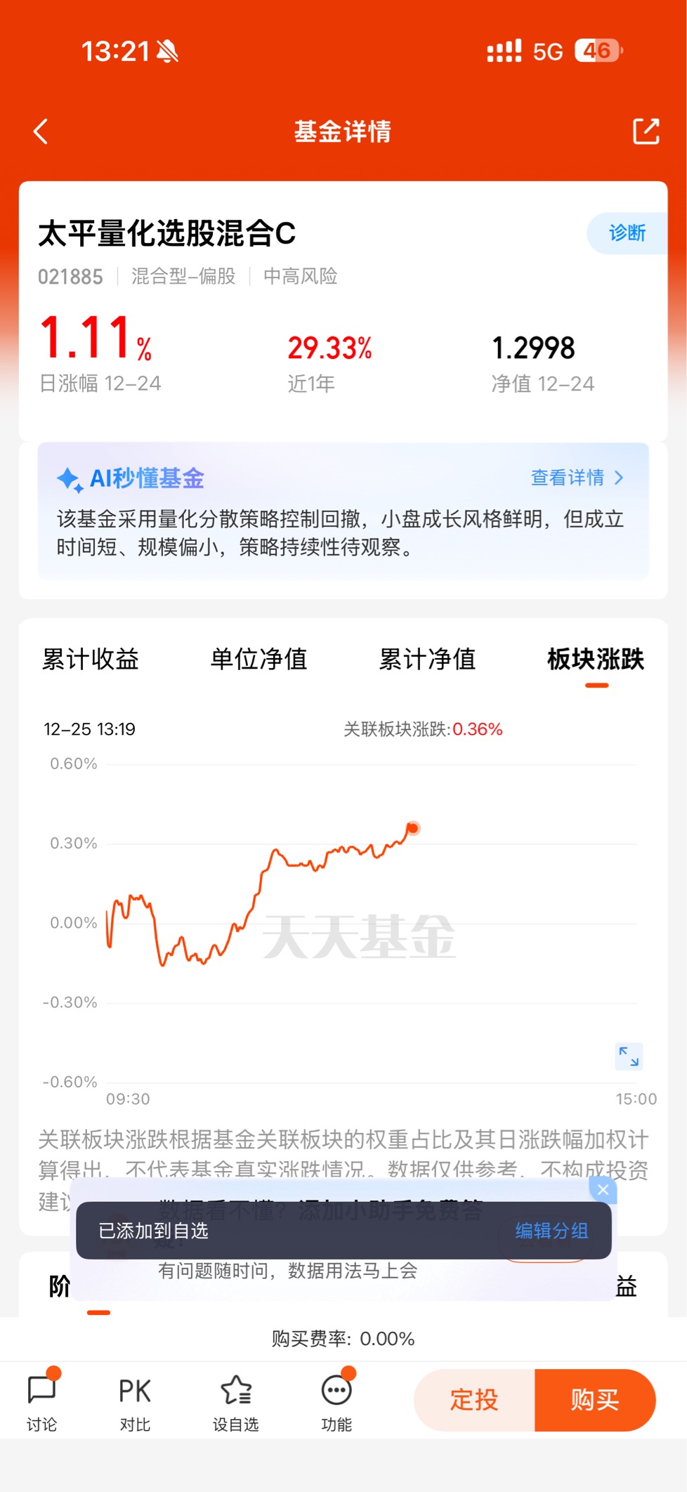 最近大盘在高位上蹿下跳,身边不少朋友都慌了神,要么忙着追涨杀跌来回折腾,要么干脆清仓离场不敢下手。而我手里的太平量化选股混合C(021885),却在这波震荡里给了我不少踏实感,今天就来跟大家聊聊我的持基经历。