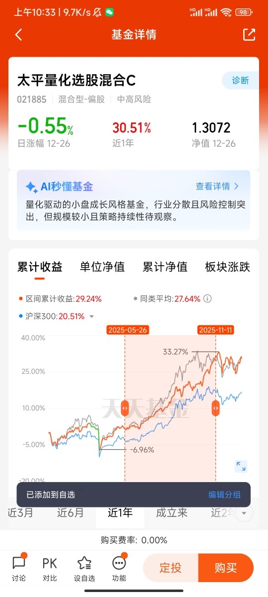 随着持仓时间拉长,基金的超额收益能力持续显现。截至2025年12月,我持有该基金已近18个月,期间大盘在3800-3900点区间震荡整理,而基金近12个月收益率达30.51%,近6个月收益率更是高达25.75%,大幅跑赢同期沪深300指数。这背后是基金经理张子权“不靠感觉靠模型”的投资哲学,以及团队持续迭代的量化策略在发挥作用——在板块轮动频繁的市场中,量化模型能快速捕捉不同因子的有效性变化,动态调整组合配置,从而在震荡中积累超额收益 。更让我惊喜的是,作为C类份额,该基金没有申购费,持有超过7天免赎回费,大幅降低了我定投和补仓的成本,进一步提升了投资效率。