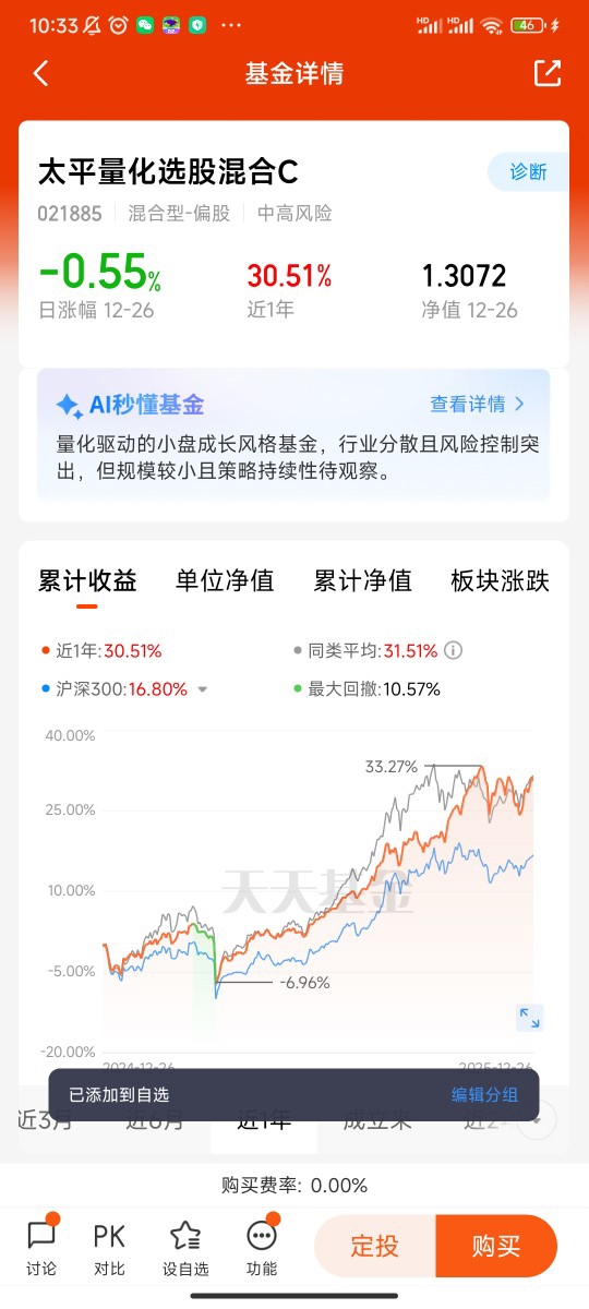 更惊喜的是,随着市场震荡企稳,这只基金的超额收益开始慢慢显现。三季度,AI、算力板块迎来一波小行情,基金通过量化模型提前捕捉到了板块机会,净值跟着水涨船高;四季度,市场风格切换到低估值红利板块,基金又及时调整了持仓权重,没有错过这波行情。到年末算账的时候,这只基金的年内收益率居然超过了25%,远超同期沪深300指数的涨幅,也跑赢了我之前买的大部分主动基金。